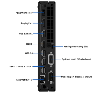 | Ports | Power, USB-C 3.2 Gen 1, USB-C 3.2 Gen 2, Headphone/Microphone combo Jack, power connector, DisplayPort, USB 3.2 Gen 1, HDMI, USB 2.0, USB 2.0 + USB 3.2 Gen 1, Ethernet, Kensington Security Slot, VGA, Serial |